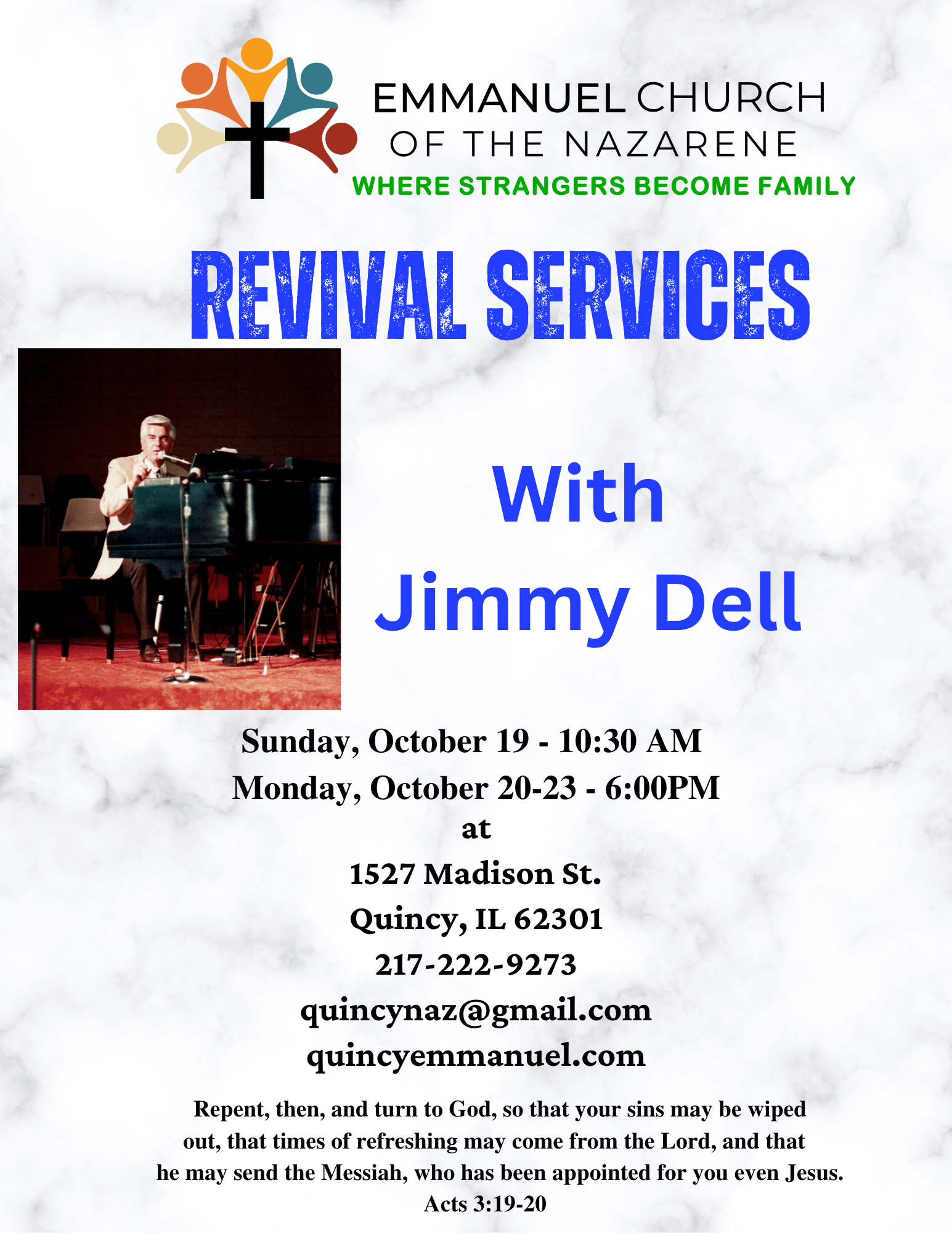 We are excited to invite you to our Revival Services at Emmanuel Church of the Nazarene, 1527 Madison St., Quincy, IL, featuring the inspiring Jimmy Dell!